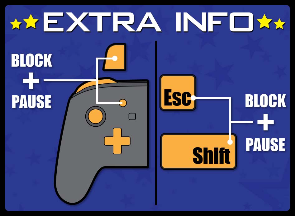 - Puedes pausar el juego y mostrar la disposición de los controles pulsando [Esc] o el botón SELECT/OPTIONS de tu mando.